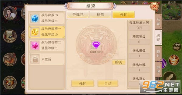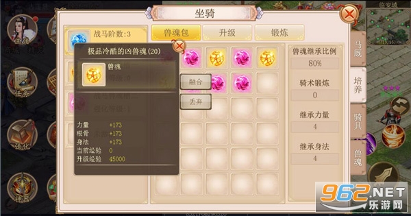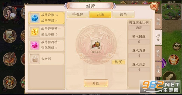 通过培养战马和兽魂槽,提升对兽魂的继承比例,可得到更多的属性加成。