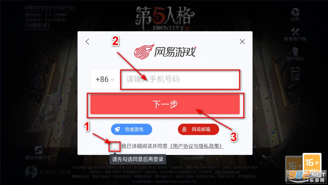 5、先勾选点击同意“用户协议与隐私政策”,再填入自己新的手机号,或者填入新的网易邮箱,最后点击下一步。就能够直接注册创建新号了!