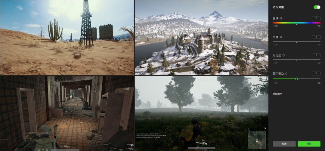 嫌弃游戏画面太暗,对亮度和对比度都不满意?Razer Cortex 雷游 Booster Prime专门针对视觉效果,让玩家根据自己的需求,从色调,亮度,对比度,数字振动四个维度,自定义更高级的画面调整方案,让玩家亲身体验前所未有的视觉冲击。