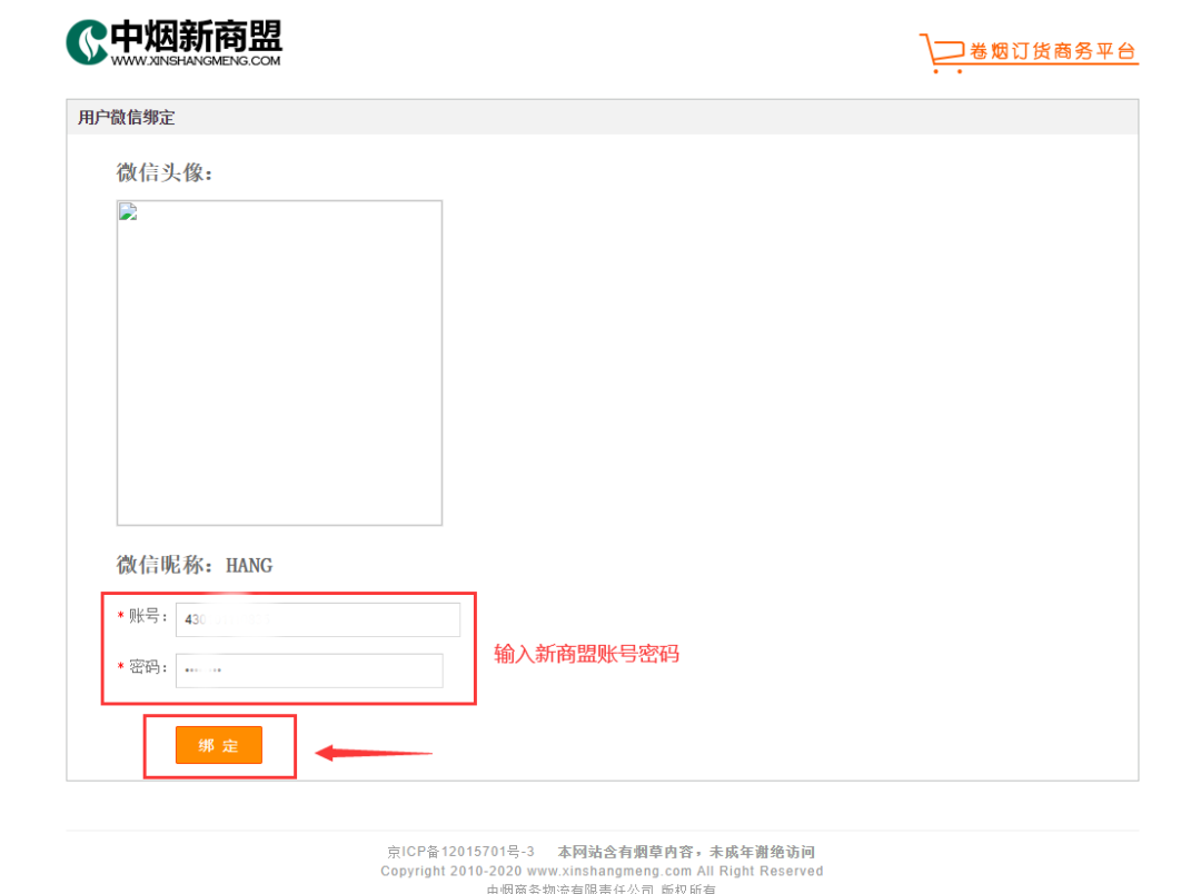4、浏览器会自动跳转至绑定页面,首次绑定需要新商盟账号、密码进行验证,输入后点击【绑定】,完成首次绑定。