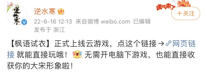 充分发挥云游戏轻量级、快启动的特质,大神云游戏助力《逆水寒》推出“枫语试衣”云试穿切片。玩家在PC/移动设备点击链接,可立即进入游戏特定玩法,试穿最热门的新时装,感受精致的会呼吸的江湖风光。沉浸体验直击行动开关,配合社媒话题裂变,一度形成舆论热点,加持IP传播,强势试玩拉新。