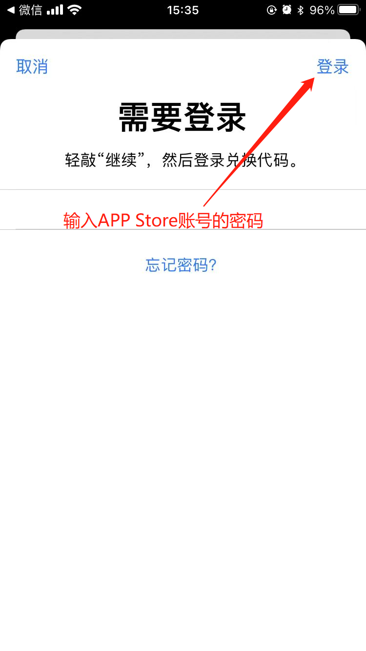 输入App Store账号的密码,点击右上角登录,进入兑换代码界面