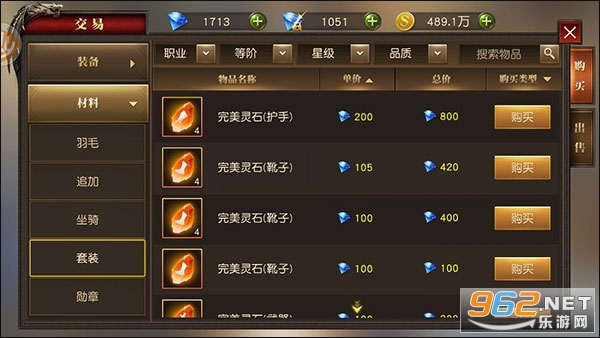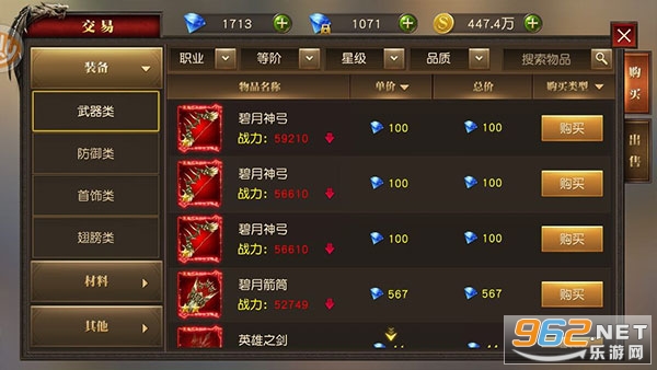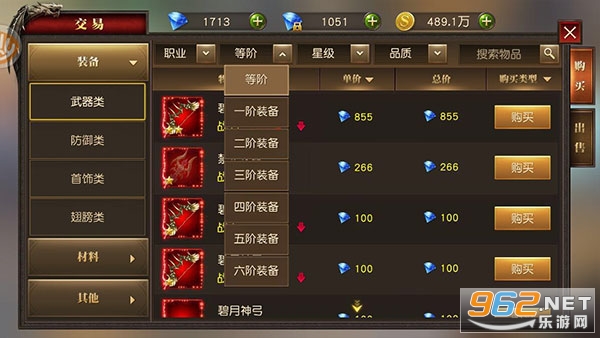 3、不仅道具进行了分类,游戏还对单个小类中增加了筛选功能。比如,在装备栏中,您可以根据职业、装备等阶、装备星级和品质进行筛选,这样方便您更快地找到自己想要的装备,而不用一页一页地去翻交易行了。同时,您也可以根据单价或总价进行筛选,一目了然地发现同类型道具中价格最低的那个。