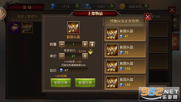 4、出售界面和购买界面则是完全不同了。在出售界面,您可以在左侧选择想要出售的道具,自定义价格和出售数量。诚然,如果您达到了一定VIP等级,还可以享受密码交易的特权。在界面右侧您还能看到其他玩家出售同类型道具的定价。推荐您在同类道具出售较多时,可以适当地降低自己的定价,这样更容易被其他玩家买走。