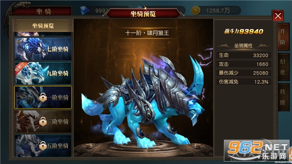 6、点击左上方的预览按钮可以预览各阶坐骑的外形和属性。
