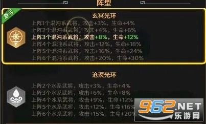 属性光环加成:每个元素系列最低上阵2个武将,即可激活对应的光环,分别为2个、3个、4个、5个、6个、相同元素系列的光环武将越多效果越强,(混沌系列比其他三个系的加成要高不少,有条件的玩家可以注重培养混沌系列)。