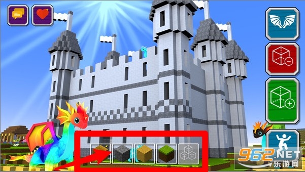 2.材料栏:快捷选择不同类型方块(草地、砖块、岩石等),点击即可切换建材。
