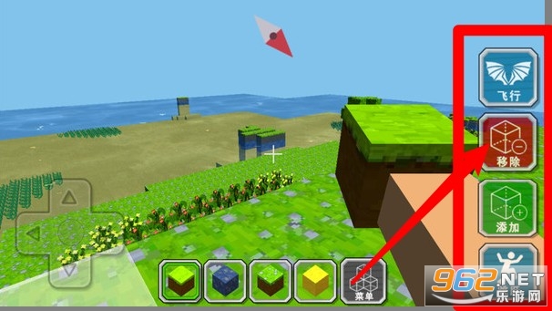 3.右侧功能键:飞行、点击即可进入飞行模式,移除、点击方块可将其删除,添加、方块放置于目标位置,跳跃、进行跳跃。