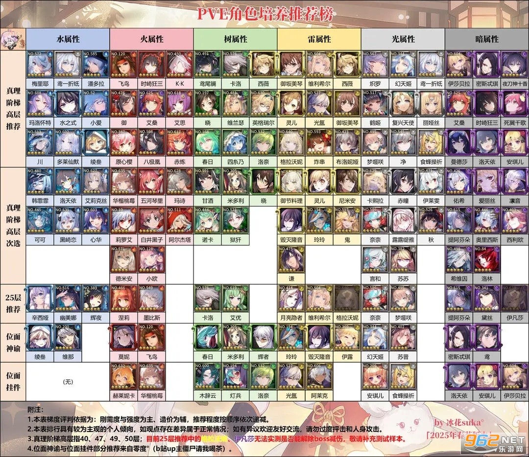 pve玩法也是血族中的重要一环:冒险进度决定你扫荡材料的丰富度,以及书册的能量回复速度;首次通关书册能获得大量的角色养成材料;位面玩法排名名列前茅可以获取钻石和14c角色碎片;六系属性塔的层数更是决定你能不能拿到五级灵券来填构装的大坑。因此,本榜罗列出属性塔和位面中刚需的各属性卡,以供游戏中后期的pve培养优先级参考。