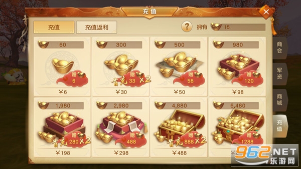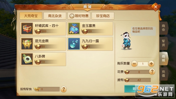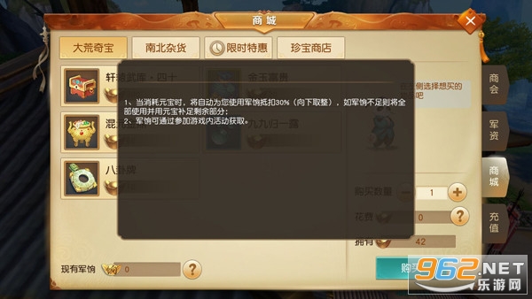 ⑧元宝或军资兑换。1元宝=10000金币,1军资=100金币。