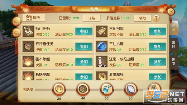 8、挑战·锁妖塔荡寇 日常·斩妖除魔、限时·蒙学乡试、限时·大荒怪题 日常·势力任务、日常·门派比武、日常·空间祝福、副本·天牢之渊、挑战·大荒演武堂的顺序一一完成。