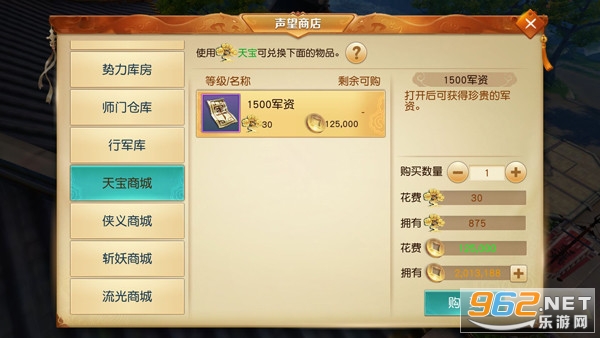 30天宝声望和125000金币可兑换1500军资,天宝声望可通过跑图获得。