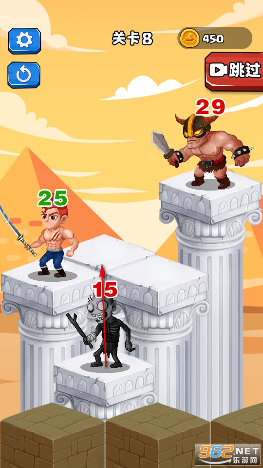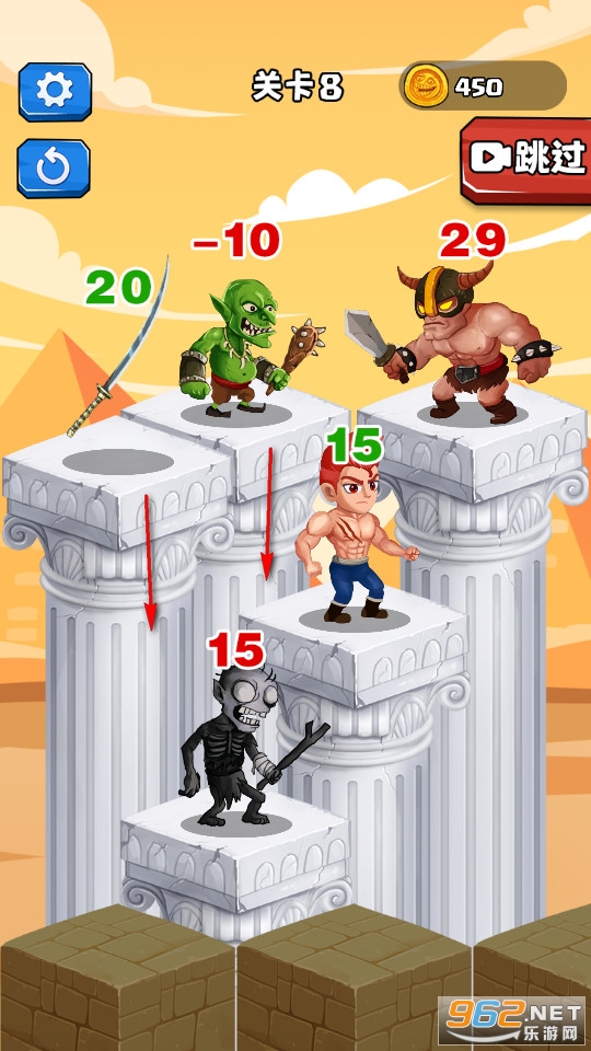《咕噜地下城》是一款肉鸽闯关类数字游戏,这款游戏需要玩家在游戏中根据自己当前攻击数值一步步规划消灭敌人,由小到大逐渐增加自身数值最终通关,游戏中场景多变,同时敌人的位置与数值也都偏随机。玩家需要移动目前所在石柱,帮助游戏内的勇士提升自己的数值,打败相应的敌人成功通关。