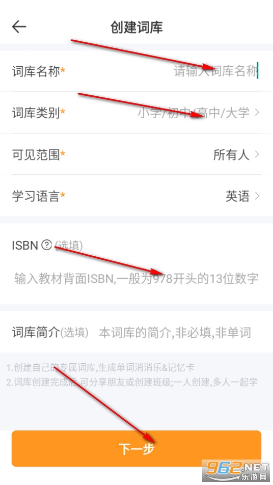 填写词库名称和词库类别,将自己想要学习的英语教材的ISBN填写进入,然后点击下一步即可创建成功。