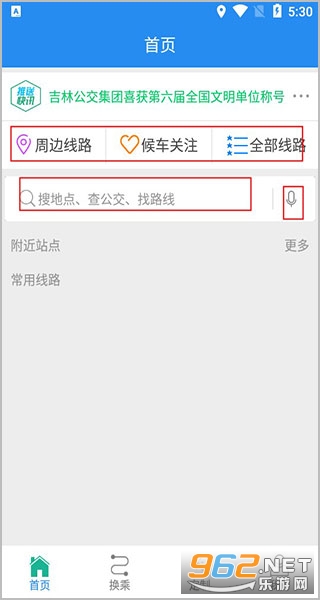 1、下载后打开进入首页,在这里可以搜索地点,查公交以及周边路线;