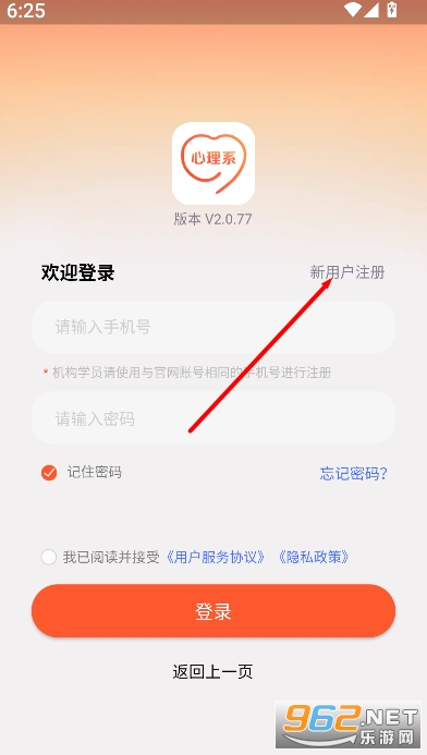 3、如为首次使用,可点击“新用户注册”,根据页面提示填写相关信息后完成注册,即可开始浏览课程与心理内容。