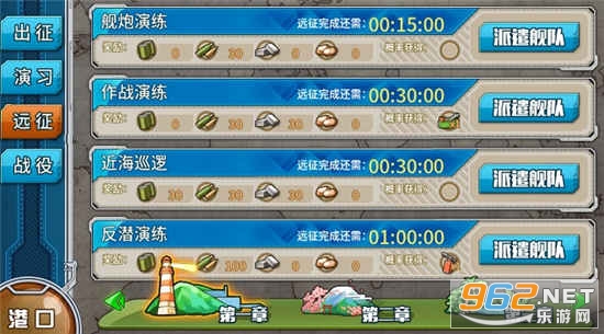 前面说到了游戏中的核心就是油弹钢铝这四项基本资源。这些资源除了日常的自然回复以外(油弹钢是60/小时,铝是20/小时)远征就是主要的资源获得方式了