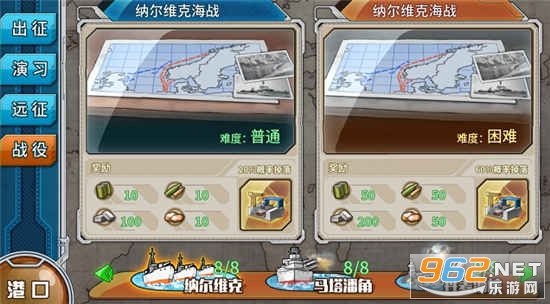 这里提督们可以进行特定的战役,都是历史上著名的海战,胜利以后可以获得一些资源奖励,并且有几率掉落舰船改造核心的,这些核心是舰船改造的必备物品。(而且这个核心也是可以出售的,可以获得一定的基础资源)